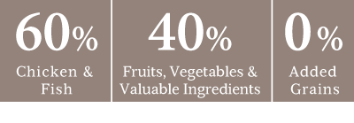 Chicken meat meal (20%), fresh chicken meat (no bones, 20%), potatoes (dried, 17%), potato meal (12%), chicken fat (10%), apples (dried, 10%), fresh salmon (4%), salmon oil (3%), fresh chicken liver (3%), spinach (0.5%), mannan-oligosaccharides (0.012%), fructo-oligosaccharides (0.012%), blackcurrants (0.01%), blueberries (0.01%), yucca schidigera (dried, 0.007525%), cranberries (dried, 0.005%), rosemary (dried, 0.0034%), catnip (dried, 0.00204%), parsley (dried, 0.00136%), psyllium seed (dried, 0.00102%), stinging nettle (dried, 0.00085%), chamomile (dried, 0.00085%), algae (ascophyllum nodosum, dried, 0.00051%)