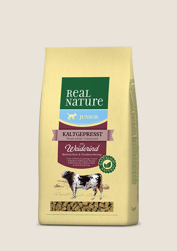 REAL NATURE JUNIOR Manzo da pascolo per cuccioli di tutte le razze è un mangime completo secco pressato a freddo adatto dallo svezzamento fino a circa 24 mesi di vita (in base alla razza e alla taglia).